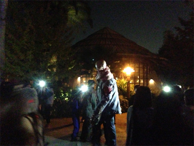 待っている間に道に突然現れたり、ライド系は(ジュラシックパークとジョーズ)は辺りが暗くなり、ポツンポツンと貞子がいます。