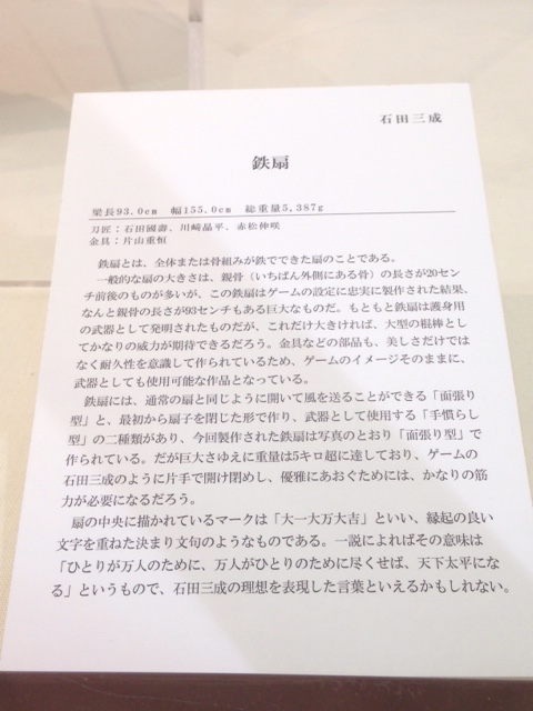 鉄扇には、通常の扇と同じように開いて風を送ることができる「面張り型」と、最初から扇子を閉じた形で作り、武器として使用する「手慣らし型」の二種類があり、今回制作された鉄扇は写真のとおり「面張り型」で作られている。だが巨大さゆえに重量は5キロ超に達しており、ゲームの石田三成のように片手で開け閉めし、優雅にあおぐためには、かなりの筋力が必要になるだろう。